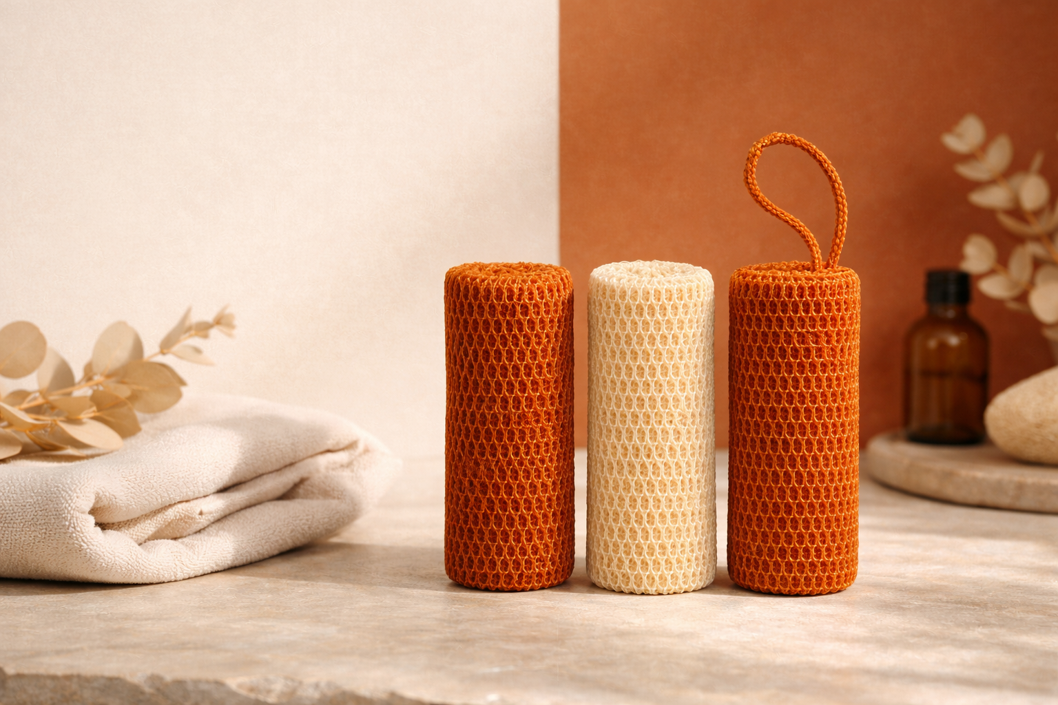 Det som skiljer den från vanliga tvättsvampar är de handgjorda knutarna i nätstrukturen. Det är knutarna som skapar den effektiva exfolieringen – de avlägsnar döda hudceller och stimulerar huden på ett sätt som släta svampar inte kan.